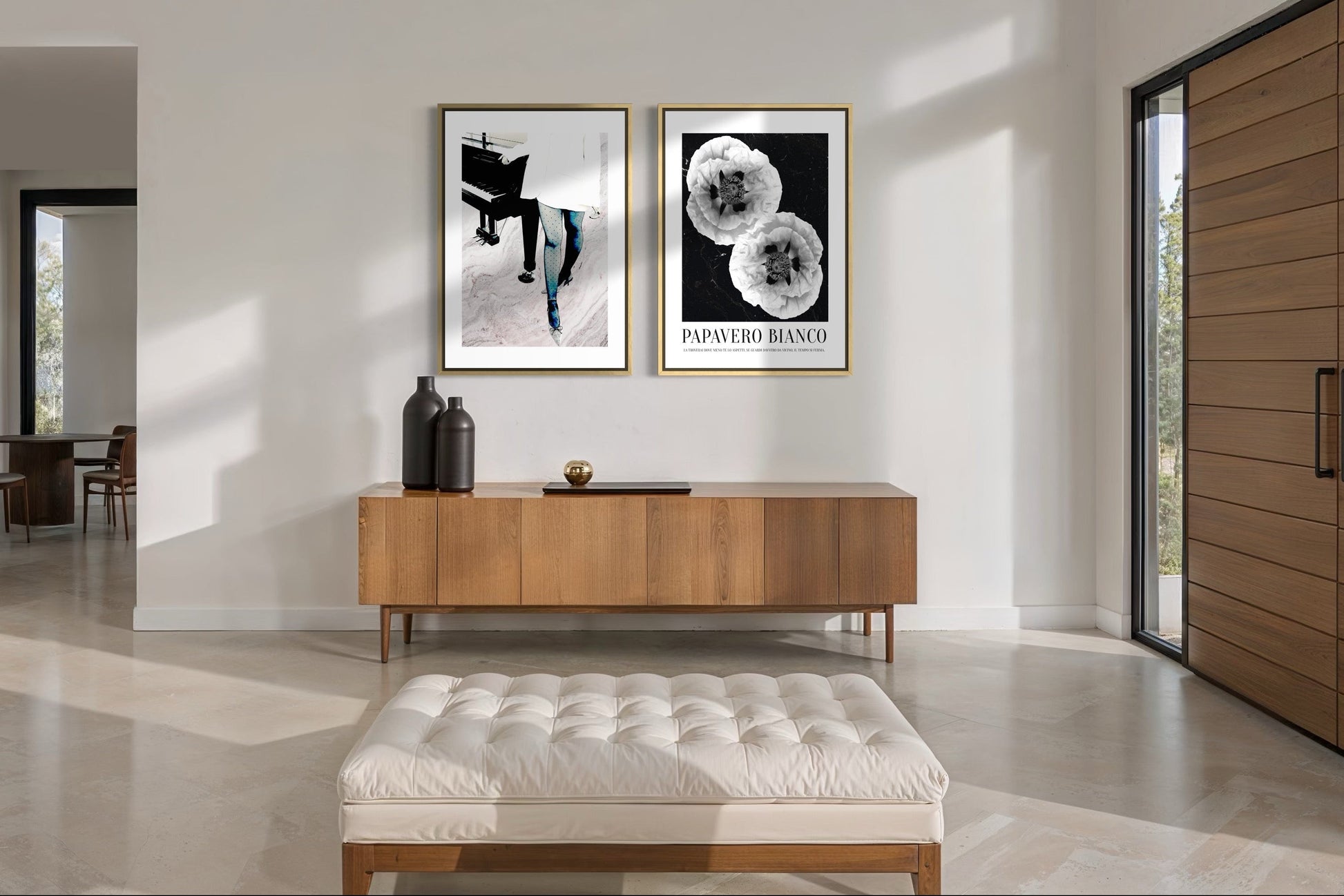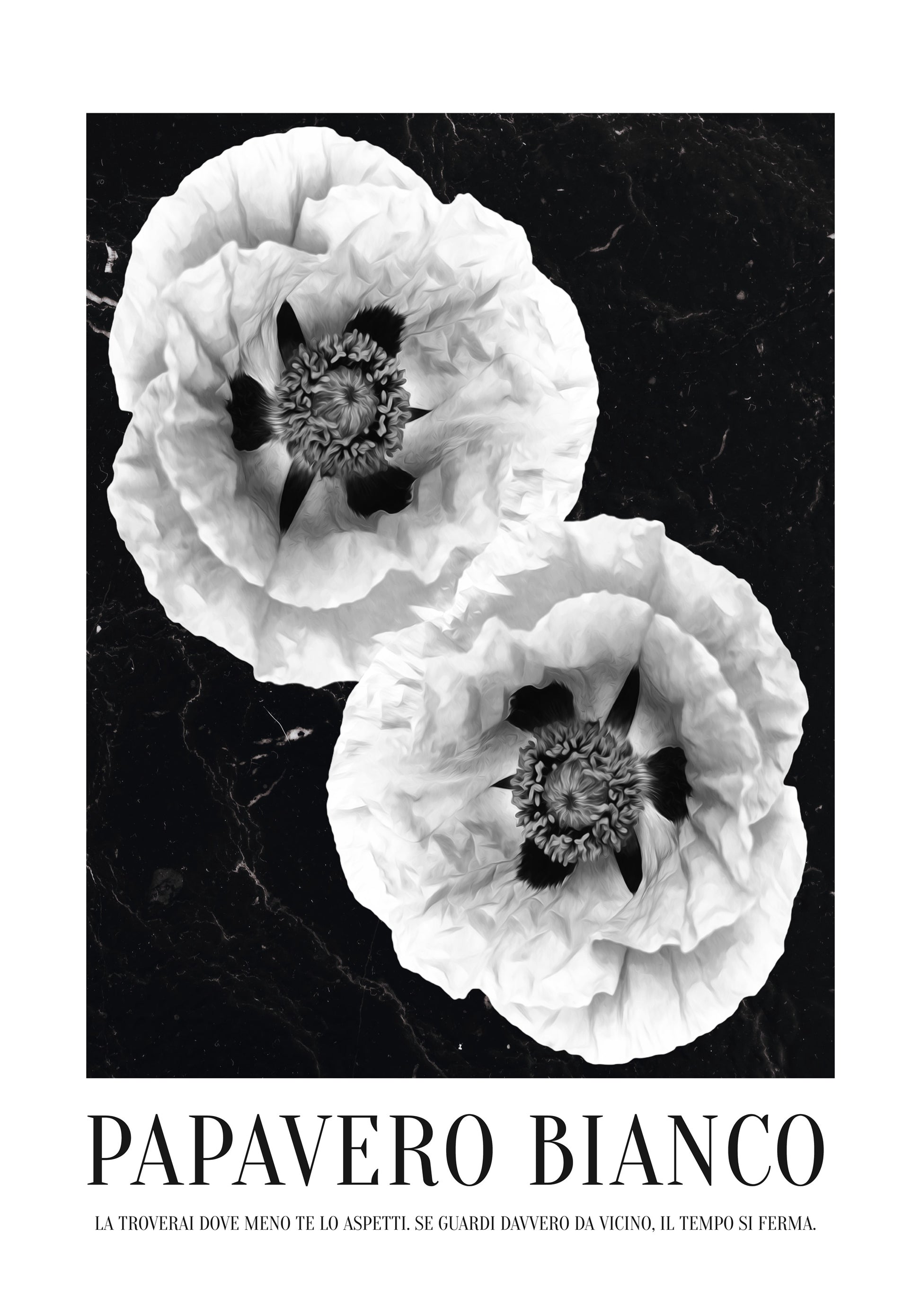 Papavero Bianco är en svartvit poster med två vita vallmoblommor placerade i ett stillsamt, diagonalt möte. Mot den mörka bakgrunden träder blombladen fram med mjukhet och djup, och blicken dras rakt in i motivet.