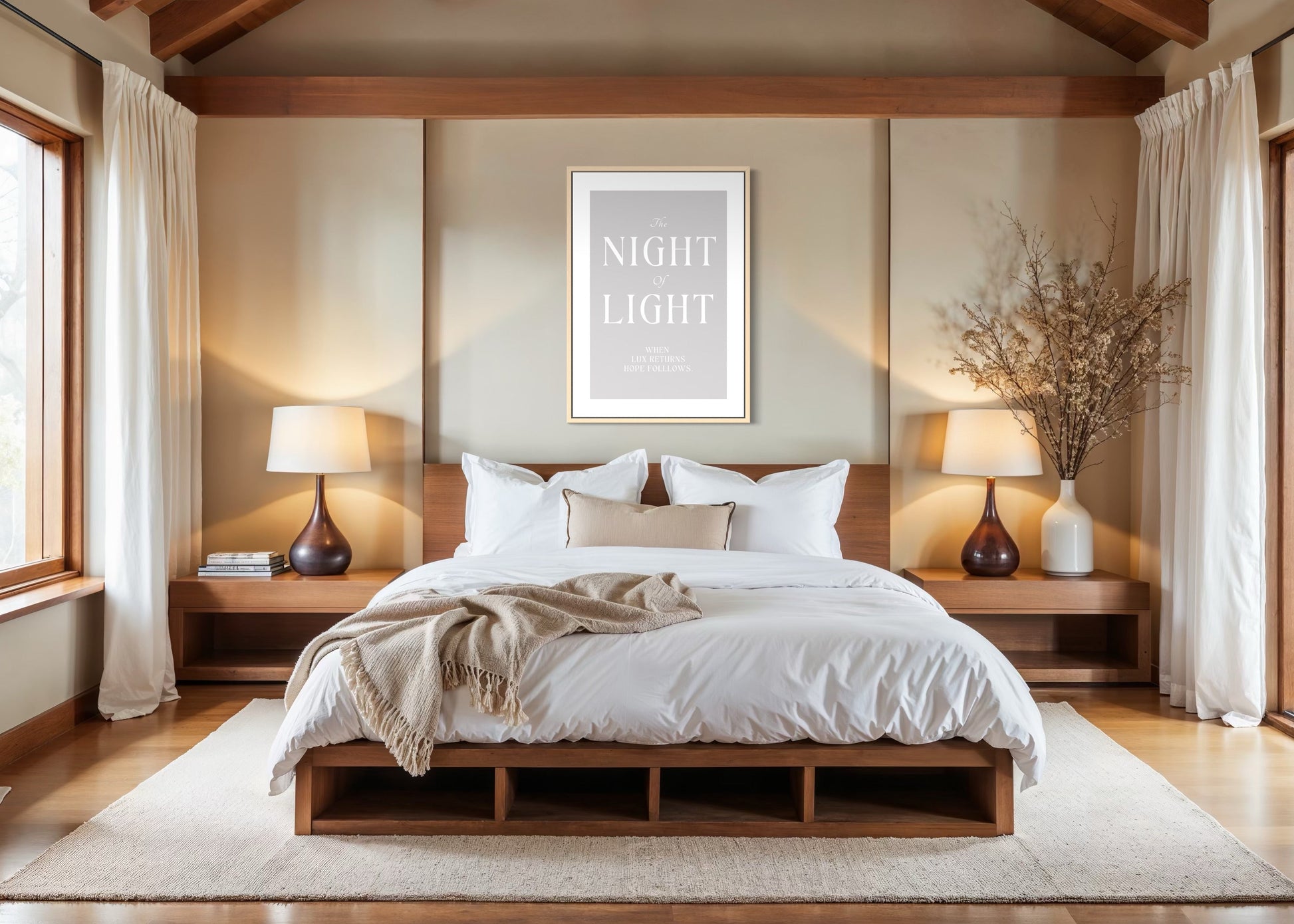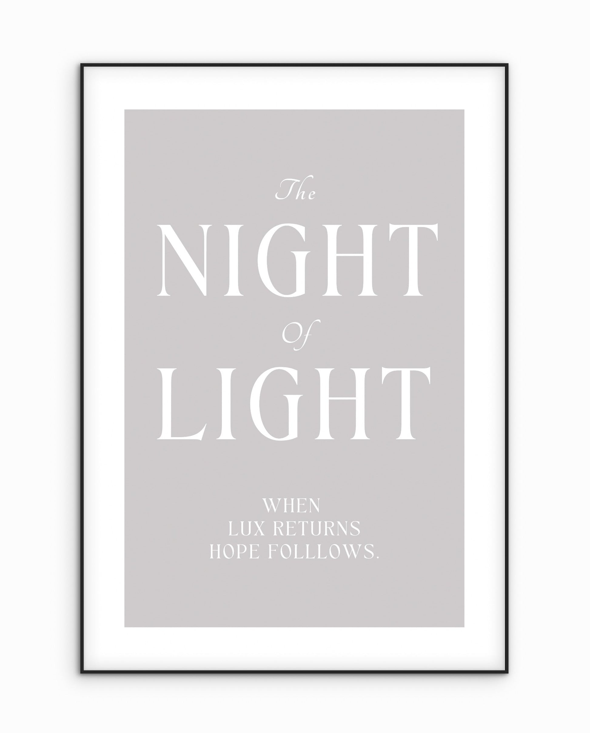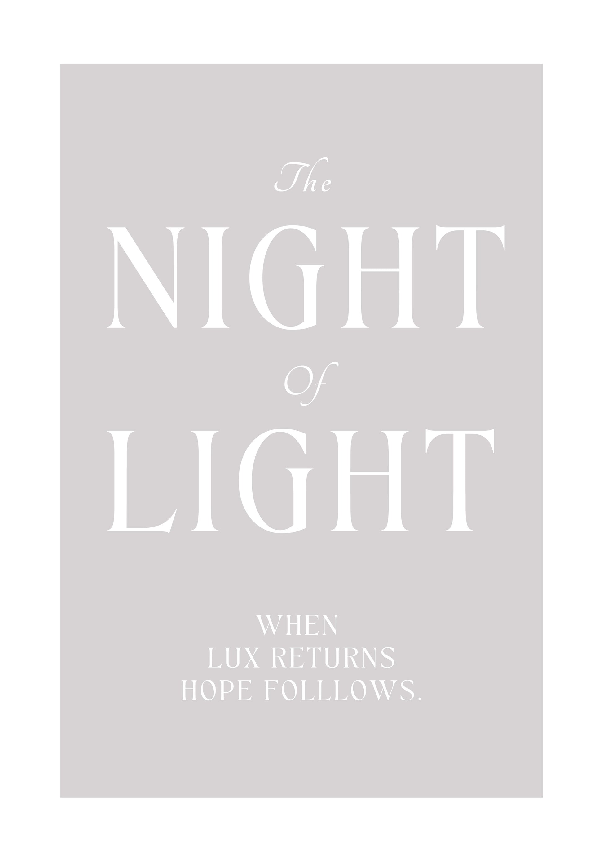 The Night of Light är en typografisk poster med vit text mot en ljusgrå bakgrund, inramad av generösa vita kanter. Orden är få och placerade med omsorg, där kontrasten mellan stor och liten typ skapar rytm och balans.